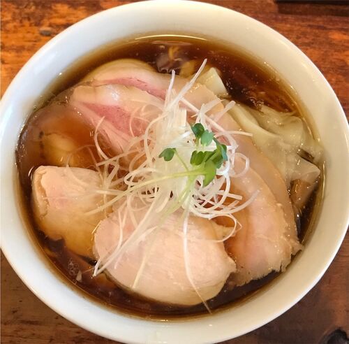 【牛骨+貝出汁の中華そば】 『キリっと醤油が効いたまろやか〜な味』 新宿駅から徒歩5分ほど。 12:15で店内2名! あれっ?これは店選び失敗か… 7月にオープンしたばかりらしいが… 俺の麺 春道があった場所の居抜きで、春道のセカンドブランドのよう。 特製…